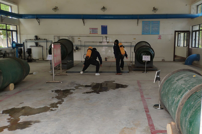 演練開始前,三水廠負責人對全廠職工進行了防火滅火知識培訓,并安排專人詳細講解了消防水袋、滅火器和呼吸機的使用方法?;顒又校瑓⒀萑藛T還分批次進行了滅火和漏氯預防實戰(zhàn)演練。