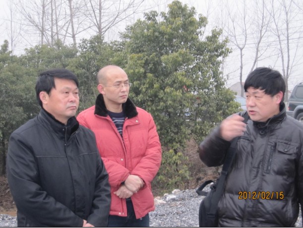荊門市供水總公司總經理陳衛(wèi)國(左一)、黨委書記陳永根(左二)到華能荊門熱電聯(lián)產工程工地,聽取該項目負責人介紹工程建設前期用水需求。