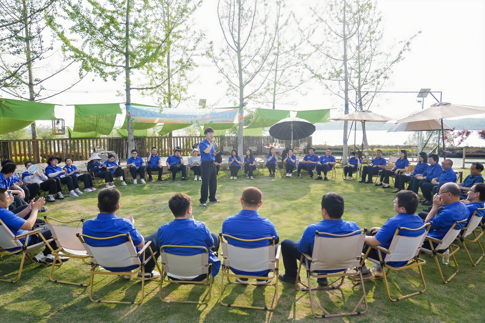 此次活動(dòng)形式新穎,將敘事會(huì)場(chǎng)地從室內(nèi)搬至戶外,青年職工們?cè)诓萜簬づ衤稜I(yíng)地打破思維桎梏,創(chuàng)新靈感泉涌。大家以小組為單位,從自身學(xué)習(xí)生活和工作經(jīng)歷出發(fā),圍繞各自對(duì)崗位的理解與追求,暢談未來(lái)發(fā)展,共話人生理想?,F(xiàn)場(chǎng)氛圍感十足,充分展現(xiàn)了青年水務(wù)人奮發(fā)有為、積極向上的精神面貌。