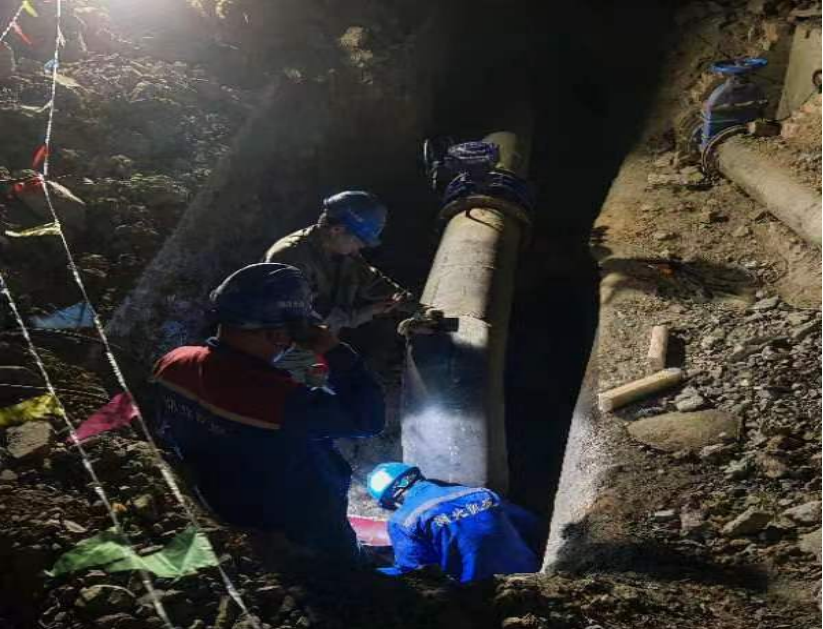 24日晚22時開始停水施工,工作人員在作業(yè)坑內(nèi)各司其職,排水、切割、加裝管夾、安裝三通、加裝閥門……工作現(xiàn)場緊鑼密鼓,人機作業(yè)井井有條,經(jīng)過5小時連續(xù)施工,圓滿完成碰頭施工,比原計劃提前3小時通水。