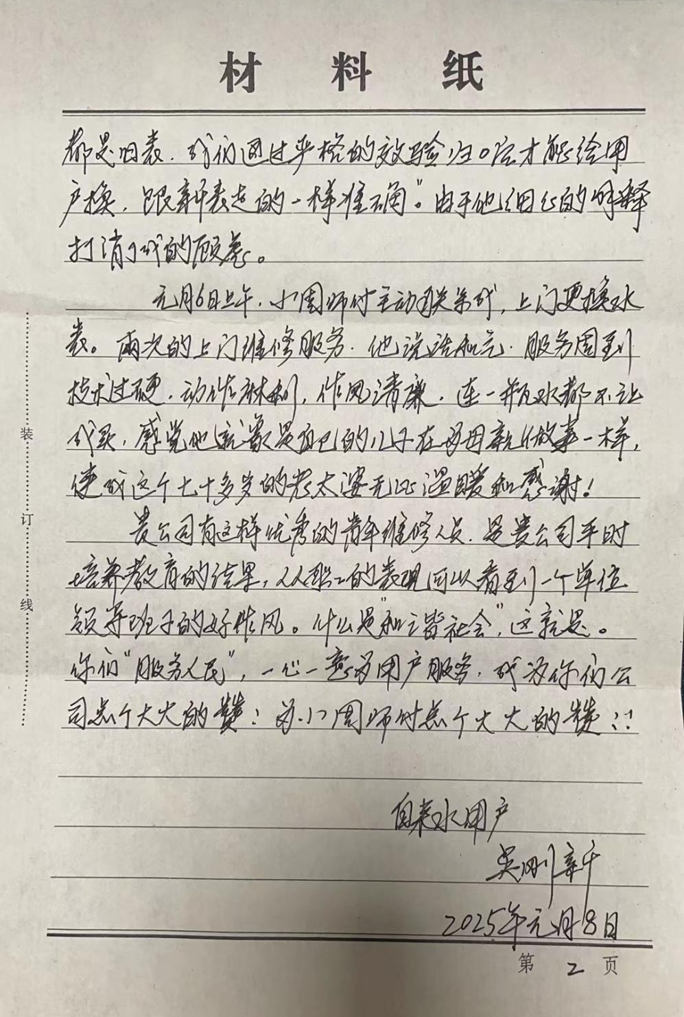 在表揚(yáng)信中,老人深情表達(dá):“家中只有我們兩位老人,水務(wù)集團(tuán)的維修人員就像我們的兒子一樣,他說話和氣,服務(wù)周到,技術(shù)過硬,動作麻利,作風(fēng)清廉,讓我們感到無比溫暖。”