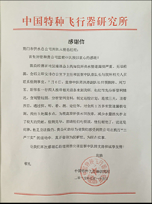 7月28日,605所相關(guān)負(fù)責(zé)人一行2人專程到公司送上“全心全意服務(wù)企業(yè)”錦旗和一封感謝信,表達(dá)公司免費(fèi)為其探測漏、減少其水量損失的謝意。
