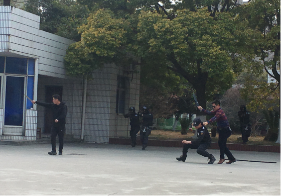 本次演練以在全國“兩會”召開前夕,2名暴恐份子密謀在市供水總公司三水廠采取投毒方式實(shí)施暴恐襲擊為背景展開。市公安局指揮中心接到水廠員工報(bào)案,2名暴恐份子駕車攜帶劇毒氰化物和匕首來到三水廠,密謀投毒、傷人。市公安局指揮中心立即派轄區(qū)派出所和巡邏組前往處置。在投毒失敗后,嫌疑人刺傷安保人員并挾持人質(zhì),與民警對峙。后,市公安局迅速啟動反恐防范一級響應(yīng),調(diào)派轄區(qū)分局、巡特警、刑偵、交警等部門趕赴現(xiàn)場開展工作。短短3分鐘,暴徒迅速被控制,其中有一名暴徒被當(dāng)場擊斃,人質(zhì)成功解救。之后,120急救中心趕往現(xiàn)場救治,同時(shí)環(huán)境監(jiān)測部門迅速開展水質(zhì)檢測評估,確保水廠供水安全。至此,反恐防暴演練活動順利結(jié)束。