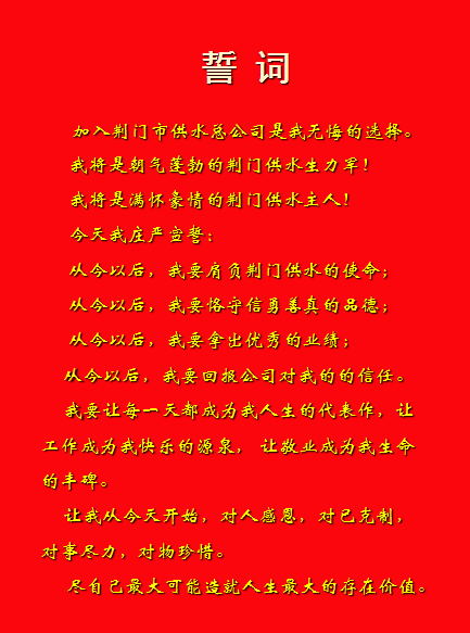 為進一步激發(fā)供水人做好本職工作的榮譽感、使命感和責任感,11月9日下午,市供水總公司在五樓會議室首次舉行新進員工入職宣誓儀式,讓他們用誓言表達對企業(yè)、對供水職業(yè)的忠誠。