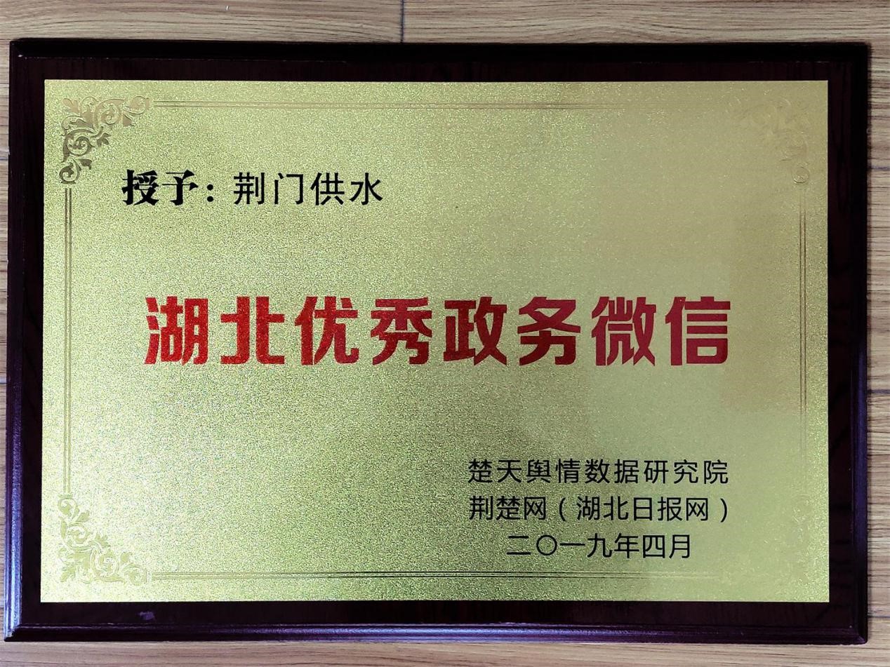 4月26日上午,由省委網(wǎng)信辦指導(dǎo)、湖北日?qǐng)?bào)傳媒集團(tuán)主辦的2019湖北第二屆政能量峰會(huì)在武漢舉行。會(huì)上,“荊門供水”微信公眾號(hào)被楚天輿情數(shù)據(jù)研究院、荊楚網(wǎng)(湖北日?qǐng)?bào)網(wǎng))表彰為“全省優(yōu)秀政務(wù)微信公眾號(hào)”。