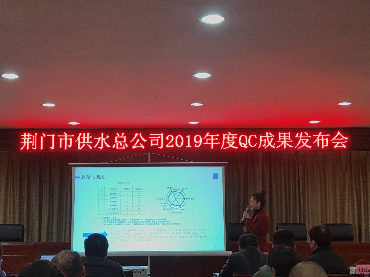 126日,荊門市供水總公司首屆QC成果發(fā)布會在總公司六樓會議室順利召開,質(zhì)量專家、國家級評審員劉佐光老師、荊門市質(zhì)量協(xié)會田政武秘書長、公司副總經(jīng)理徐安祥及各部門主要負(fù)責(zé)人參加了發(fā)布會,會議由QC工作組組長劉昕平主持。