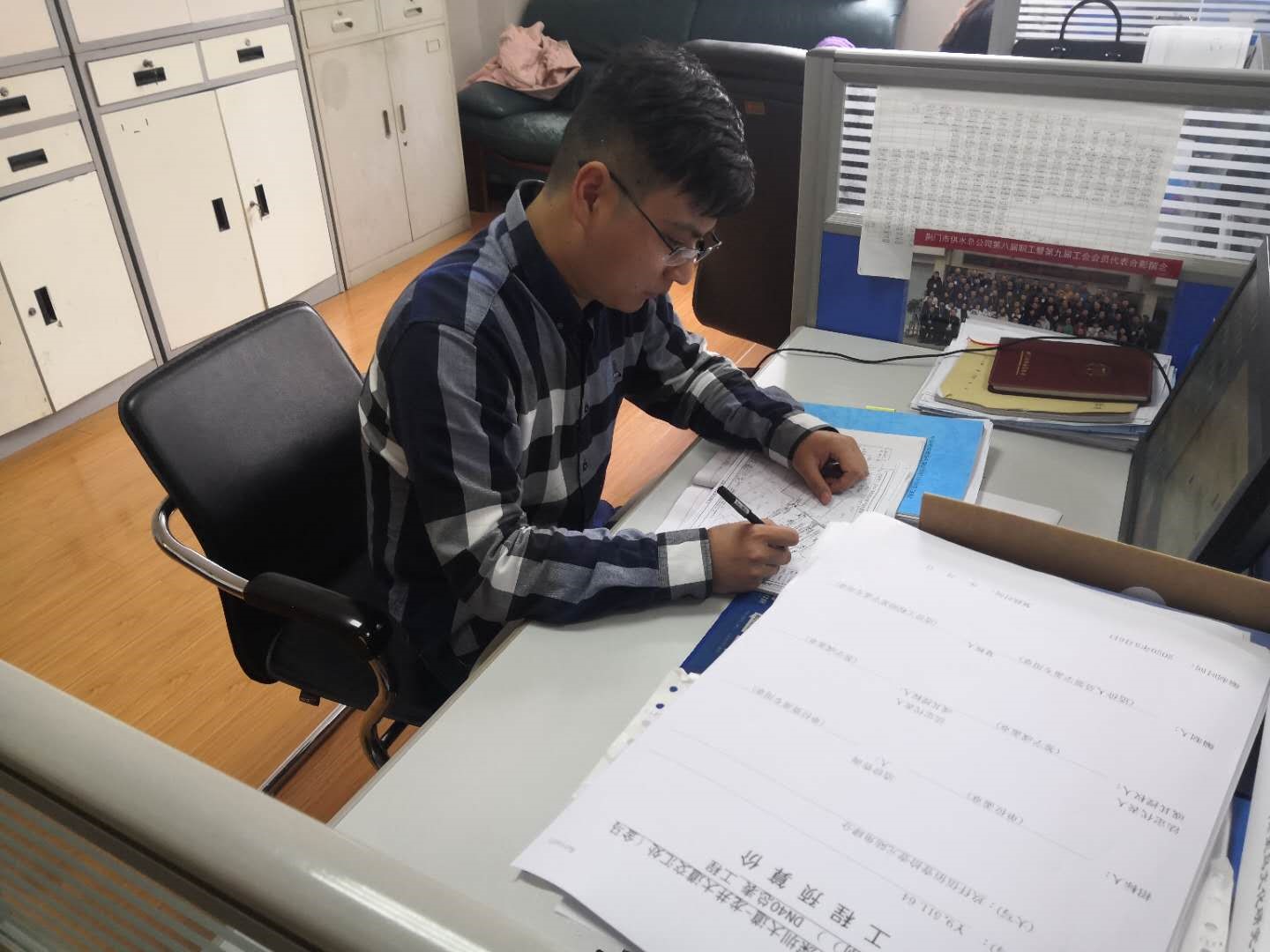 劉貝的主要工作是用戶報(bào)裝接待、現(xiàn)場(chǎng)勘察、圖紙預(yù)算審核傳遞、工程合同擬定、下發(fā)施工通知單、客戶咨詢等。2019年,他共受理用戶現(xiàn)場(chǎng)勘察約700起,平均每周約15起,勘察范圍西至宏圖愛(ài)飛客小鎮(zhèn)、東至彭墩長(zhǎng)壽產(chǎn)業(yè)園、南至團(tuán)林汽車(chē)工業(yè)園、北至子陵萬(wàn)華工業(yè)園等,全年共擬定各類大小合同約340份,下發(fā)各類施工通知單約500份,從未受到用戶投訴。