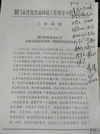 7月13日,市委副書記、市委政法委書記李濤在市優(yōu)化辦第2期工作簡(jiǎn)報(bào)專文《荊門市供水總公司開展不滿意度調(diào)查 問題整改接近尾聲》上作出批示,指出“市供水總公司在改進(jìn)服務(wù)、提高工作效率方面力度大、行動(dòng)快、成效好,值得各地和市直有關(guān)部門學(xué)習(xí),望再接再厲,為荊門高質(zhì)量發(fā)展再立新功”,對(duì)公司優(yōu)化供水服務(wù)工作給予高度評(píng)價(jià)和充分肯定。