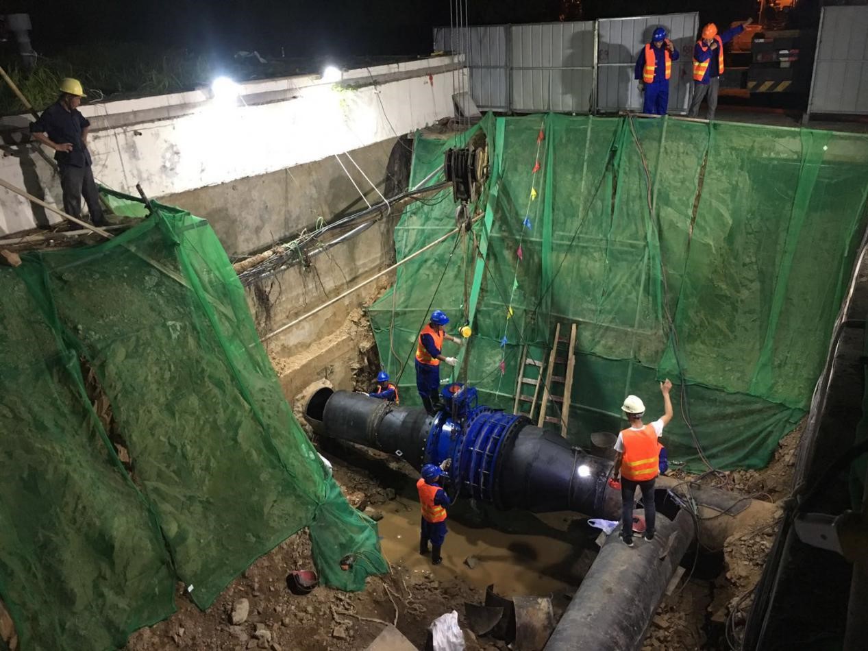 20日晚10時,項目現(xiàn)場管理人員強化工序銜接,緊盯現(xiàn)場監(jiān)督,施工作業(yè)人員挑燈夜戰(zhàn),施工隊伍兵分三路,密切協(xié)調(diào)配合,分別對DN1200、DN1000鋼管共5處碰頭點進行施工,管道切割、排水、吊裝、安裝閥門、焊接……施工現(xiàn)場井然有序,一道道工序推進有條不紊,不一會兒工人們的汗水都濕透了全身。21日凌晨2:00突降暴雨,施工人員“硬核”表現(xiàn),克服惡劣天氣的影響,在水中連續(xù)辛勤作業(yè)近10個小時,碰頭任務(wù)于21日8時順利完工。