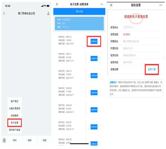用戶在繳費成功后,只需關(guān)注“荊門市供水總公司”微信公眾號或登錄網(wǎng)上營業(yè)廳,進入電子發(fā)票模塊,即可查詢、申領(lǐng)、下載打印水費電子發(fā)票。目前,電子發(fā)票系統(tǒng)運行平穩(wěn)順利。