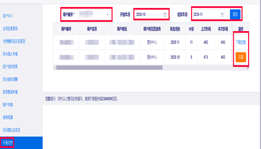 3.點擊“開票信息”選擇“用戶編號”,選擇月份,點擊“查詢”,點擊“開票”,點擊“發(fā)票下載”。
